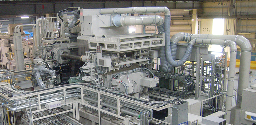 取り出しロボット、スプレーロボット、インサート装置、堰折り(トリミング)装置などダイカストマシンの周辺装置における一連の自動化について、設計から製作・据付・試運転調整およびユーティリティ(配管・電源)工事に至るまで一貫した対応を行います。鋳造工場等の環境改善、自動化・省力化に役立っています。