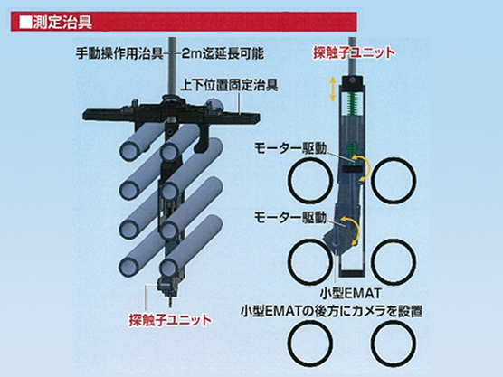 専用の治具を用いて探触子ユニットを昇降させ、探触子ユニットに取り付けたモータにより小型EMATを左右・回転方向に操作して測定を行います。