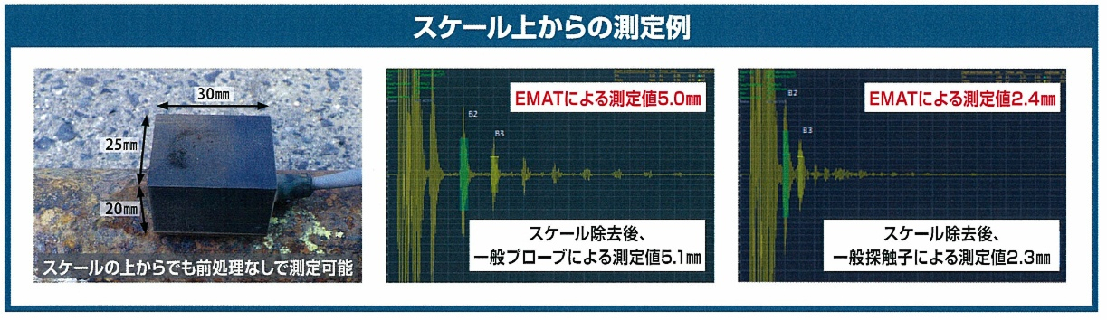 手の届かないボイラ管の深層部などを、表面処理・接触媒質なしでスケール上からの肉厚測定が可能です。