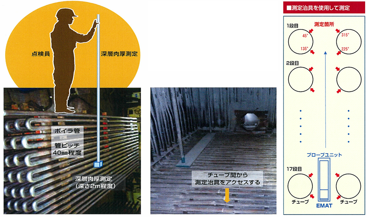 本システムはボイラ管の深層部など手の届かない箇所の肉厚測定を対象としたものです。