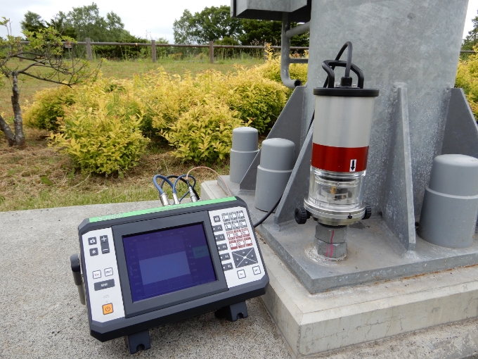亀裂点検治具・探触子を使って、埋没しているアンカーボルトに内在する亀裂の有無、その亀裂の寸法、また、アンカーボルトの長さを測定します。