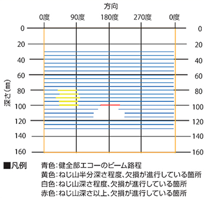点検の結果は、探傷器画面上にアンカーボルトの展開図(0度〜360度)として表示されます。