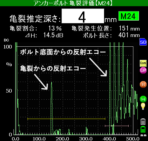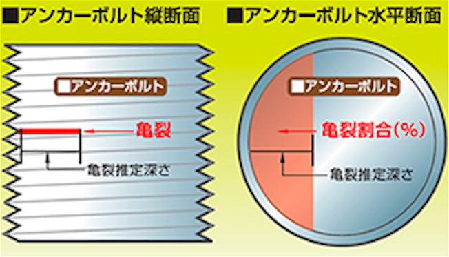 点検評価結果は、亀裂推定深さ、亀裂割合、亀裂発生位置、アンカーボルト長さ(全長)が表示されます。