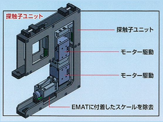 専用の治具を用いて探触子ユニットを昇降させ、探触子ユニットに取り付けたモータにより小型EMATを左右・回転方向に操作して測定を行います。